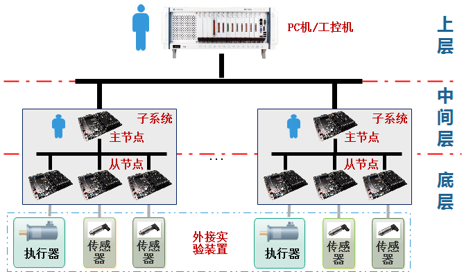 其中上层由PC机或工控机构成,中间层由嵌入式主节点组成,底层则为嵌入式从节点构成的测控智能单元。嵌入式主节点与嵌入式从节点采用统一的硬件设计,并以“主1从3”的形式组合构成实验子系统。上层PC/工控机通过USB协议转换模块实现与实验子系统主节点的总线连接,可以支持LabView软件应用、Visual C++编程设计等课程的实验教学。实验子系统各总线节点硬件组成全部开放,统一固定安装在多孔网板上,各总线节点之间连线均布置于多孔网板前面板上,并以“主上从下”的形式进行排列,以便学生能够对总线节点内部组成有清晰的直观认知。