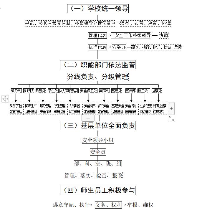 议事日程、纳入校级领导班子成员职责清单、纳入下级党政负责人年度述职和政绩考核的重要内容,督促落实安全工作“一岗双责”制度,推动构建安全工作责任体系;强化安全宣传教育和舆论引导,将安全工作方针政策和法律法规纳入班子成员理论学习内容和各级干部培训内容;坚持安全例会制度,每季度至少召开一次安全例会,统筹协调全校安全工作,及时组织研究解决安全工作的重大问题;加强安全基础建设,严格实行高危项目审批和校园规划、设计、建设、管理等各项工作的重大安全风险“一票否决”,为安全工作提供组织、财力、物力保证;依法领导和组织安全事故应急救援、调查处理及信息公开工作。